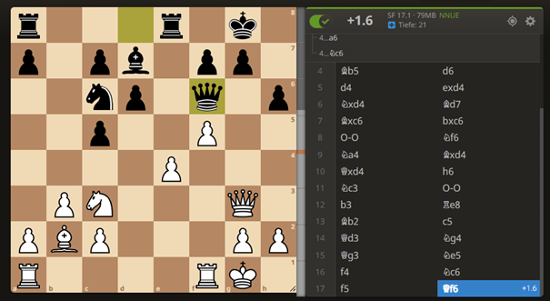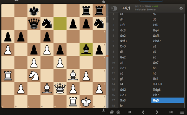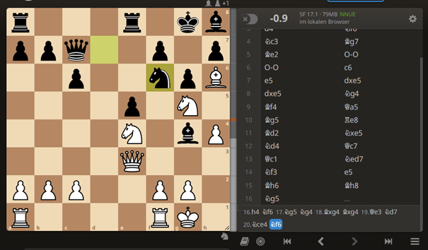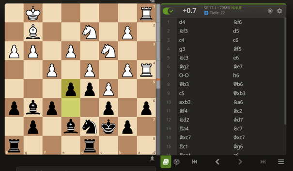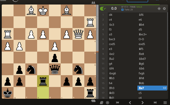 Norbert erreichte gegen den rund 400 DWZ stärkeren Langenfelder nach 17 Zügen eine vorteilhafte Stellung (+1,6). Durch genaue Entwicklung und aktives Figurenspiel brachte er sich in eine aussichtsreiche Mittelspielsituation.