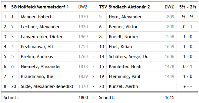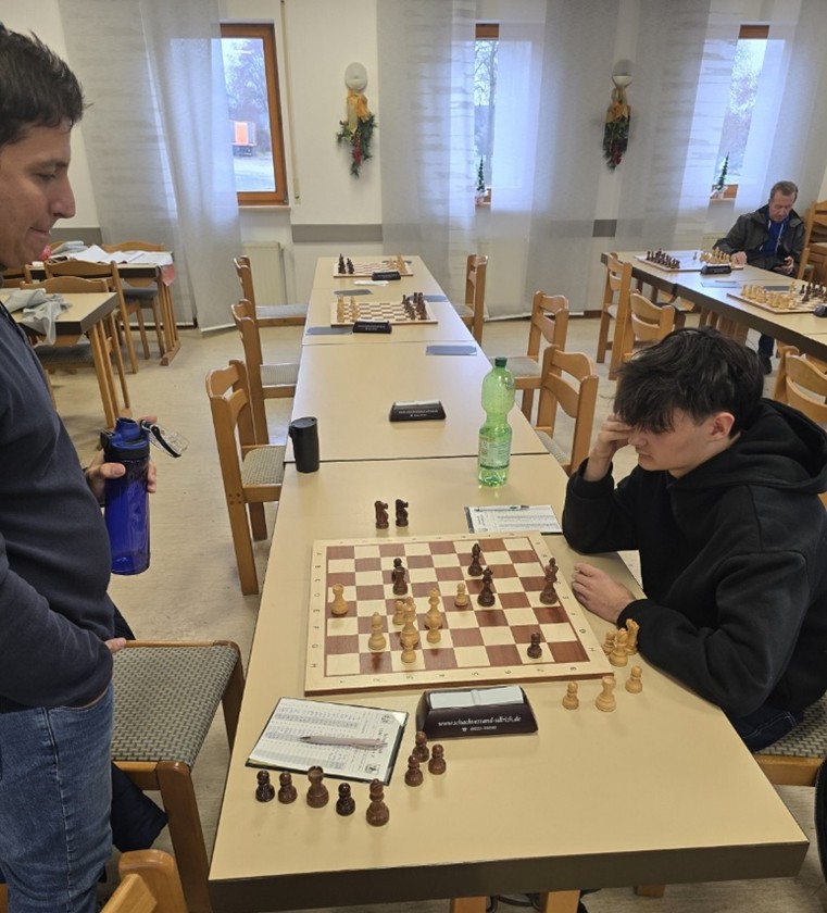 Somit verliert Bindlach II 2,5 zu 5,5 und rutscht auf den letzten Platz in der Tabelle. Nächste Runde am 18.1.26 muss gegen den Zweitplatzierten Bamberg 3 ein Sieg her, sonst ist der Abstieg kaum mehr abzuwenden.