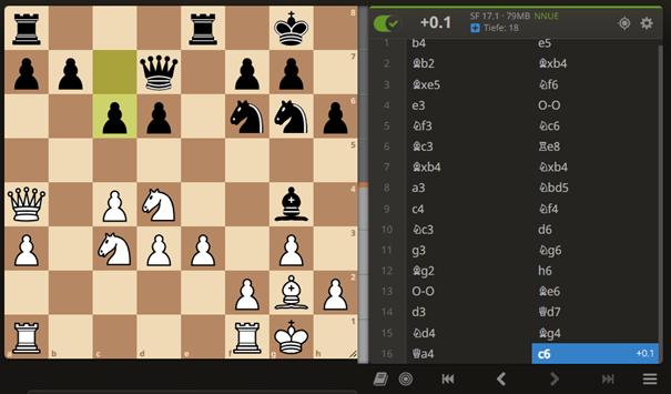 Serge erreichte nach 16.Da4; c6 eine vollständig ausgeglichene Stellung. Beide Seiten standen solide und verfügten über harmonisch entwickelte Figuren, sodass ein langes, strategisches Mittelspiel entstand.