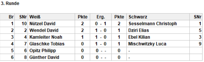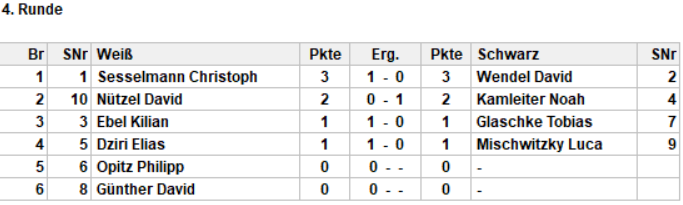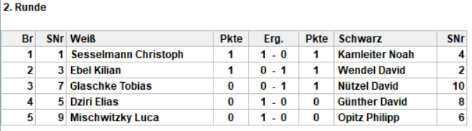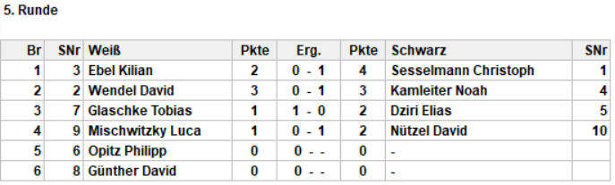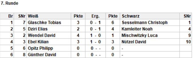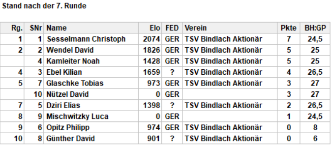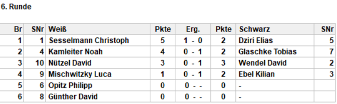 Als DWZ-Favorit konnte Christoph Sesselmann seine Überlegenheit beweisen und alle Partien für sich entscheiden. Auf Platz 2 und 3 folgten David Wendel und Noah Kamleiter mit jeweils 5 Punkten.