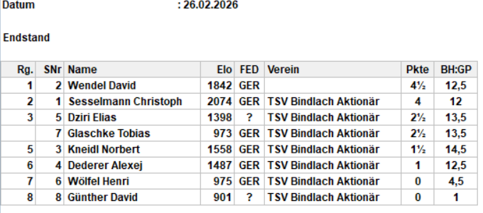 Acht Leute waren beim Schnellschachturnier im März im Vereinsheim. Gespielt wurden 5 Runden 15 min + 0 sek. Unsere Jugendspieler musste nach der ersten Runde wieder vorzeitig nach Hause.