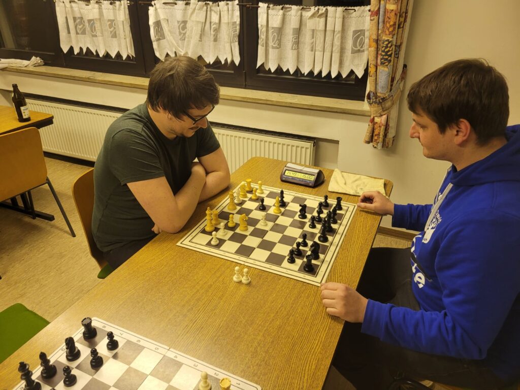 Super Sache, dass trotzdem immer die erste Runde mitgespielt wird! Der Abteilungsleiter David konnte den 2. Abteilungsleiter Christoph mit sogenannten “billigen Tricks” hinters Licht führen und so die alleinige Führung im Turnier übernehmen. Nur Tobias konnte David in der letzten Runde nach einer langen Theorievariante ein Remis abringen.
